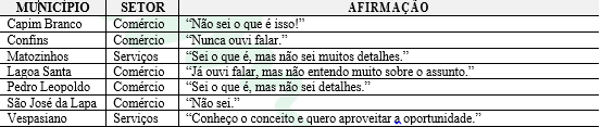 A Tabela 2 mostra uma síntese de algumas afirmações dos respondentes sobre esta questão.