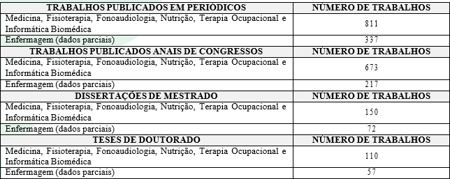 No que se refere à pesquisa, em 2013 foram aprovados 394 projetos, pelo comitê de ética em pesquisa. Os principais produtos das pesquisas são: conhecimento gerado a partir das pesquisas, formação e desenvolvimento de pesquisadores, publicações em periódicos científicos. Na Tabela 3 observa-se o número de trabalhos publicados por cada curso atendido pelo HCFMRP-USP: