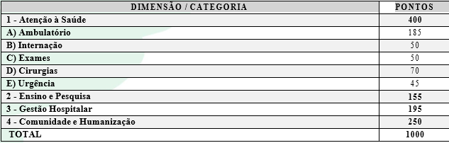 Durante a pesquisa não foi possível identificar os critérios utilizados para chegar a essas pontuações. Considerando que pontuação atribuída a cada uma das categorias é diferente, quanto maior o peso de cada categoria, maior seu impacto no resultado final da avaliação de desempenho. Nesse caso, é possível assumir que a categoria com maior peso, no caso Atenção à saúde, seja prioridade para a gestão do HCFMRP-USP e para o SUS.
