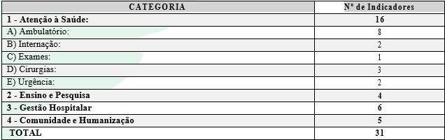 Dentre os indicadores estratégicos, 16 indicadores e 400 pontos estão na categoria atenção à saúde. Eles representam aproximadamente 51,6% dos indicadores-chave e 40% dos pontos da avaliação. Pode-se perceber que todos são indicadores de caráter geral e demonstram resultados da assistência do HCFMRP-USP como um todo.