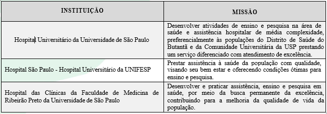 Diante dos desafios apresentados à gestão e à avaliação de desempenho das oganizações de saúde, é importante compreender também as especificidades dos hospitais universitários. Parte-se então da premissa de que a missão de qualquer hospital ao prestar serviços de saúde é resolver os problemas de saúde dos pacientes (eficácia), da melhor forma (qualidade) da forma mais econômica possível (eficiência) (Ioan, Nestian & Tita, 2012). Os HUs devem atender a esses objetivos em sua missão e cumprir outros objetivos, principalmente relacionados ao ensino e pesquisa. Esse fato pode ser evidenciado pelas declarações de missão de alguns hospitais universitários, exemplificados aqui no Quadro 1: