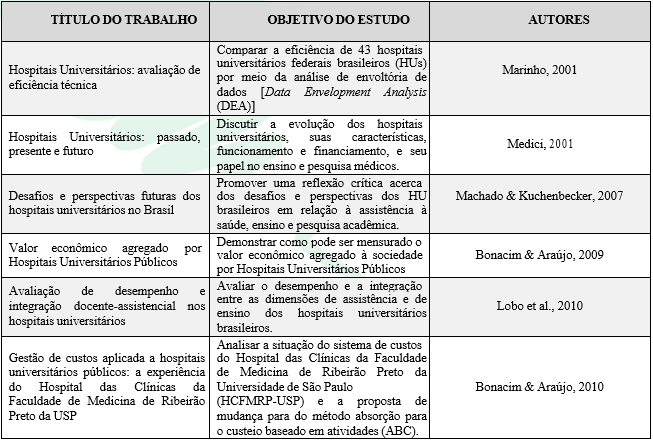 Percebe-se que apenas dois dos trabalhos destacados tratam de alguma forma a avaliação de desempenho em HUs. O estudo de Lobo et al. (2010), está relacionado com a avaliação de desempenho em HUs. Porém ele dirige-se mais à integração entre a assistência e o ensino do que à mensuração dos resultados da instituição como um todo. Já o trabalho de Marinho (2001) mensura a eficiência dos HUs por meio do DEA (Data Envelopment Analysis), mas não se preocupa com o funcionamento interno dessas organizações, e, tampouco, com os mecanismos e atividades de avaliação de desempenho.