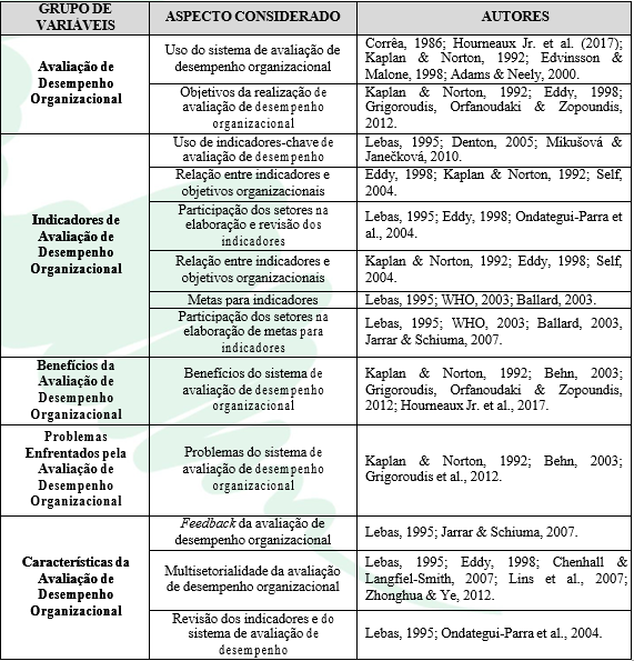 Portanto, é importante que se compreenda os elementos de avaliação de desempenho dentro desse contexto dos hospitais universitários públicos. No Quadro 3 estão sintetizados os grupos de variáveis levantadas (categorias teóricas do estudo), os aspectos de avaliação considerados e os autores consultados para este trabalho.