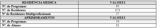 Na Tabela 2 são apresentados o número de programas de residência médica e aprimoramento do HCFMRP-USP: