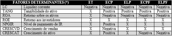 A variável ELP, como variável dependente, manteve em seu modelo as variáveis LC, ROA e TANG, com coeficientes negativos para os dois primeiros (-0,159 e -0,161) e positivo para TANG, com 0,113 (Tabela 2). Estes são resultados são significativos (Tabela 4) e descrevem que Liquidez Corrente (LC) e Retorno sobre os Ativos (ROA) conseguem explicar a variável Endividamento a Longo Prazo de com seus resultados negativos; já o inverso acontece com a variável explicativa que trata de Tangibilidade.