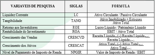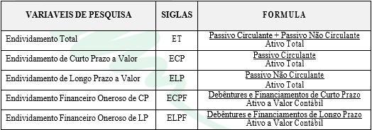 As variáveis que compõem o presente estudo estão demonstradas no Quadro 1 e no Quadro 2, expondo o nome das variáveis, suas siglas e fórmula de cálculo, apresentados a seguir: