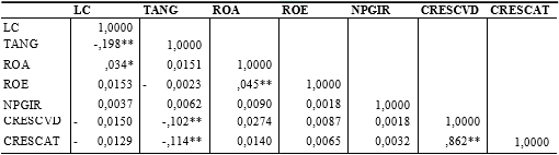 Vasconcellos e Alves (2000) afirmam que uma maneira de diagnosticar a multicolinearidade consiste na análise dos coeficientes de correlação entre as variáveis independentes do modelo. Para tanto, à este estudo, a tabela 1 apresenta os resultados da matriz de correlação de Pearson, a seguir: