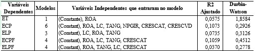 Para a regressão na qual envolveu a variável ET, com poder explicativo de 5,75% (Tabela 2), nota- se que a variável independente ROA é significativa. Com isso, é possível dizer que o Endividamento Total das empresas analisadas são explicadas por meio do Retornos sobre os Ativos de maneira negativa (-0,240). As variáveis independentes de LC, TANG, ROE, NPGIR, CRESCVD e CRESCAT não entraram no modelo, não possuindo um nível significativo de 5% para poder explicar o Endividamento Total (Tabela 4).