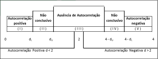 Esta afirmação é confirmada devido aos cálculos necessários para conhecer em que posição se encontra a autocorrelação residual, pois o teste de Durbin-Watson poderá possuir resultados que transitam entre 0 e 4, assim, como apresentado anteriormente, resultados próximos de 2 demonstrarem ausência de autocorrelação residual.