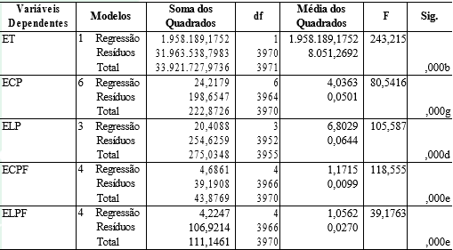 A Tabela 3 nos evidencia que todas as regressões múltiplas lineares realizadas com as variáveis dependentes ET, ECP, ELP e ECPF são significativas, pois é menor que a significância, rejeitando a hipótese de que R2 é igual a zero.