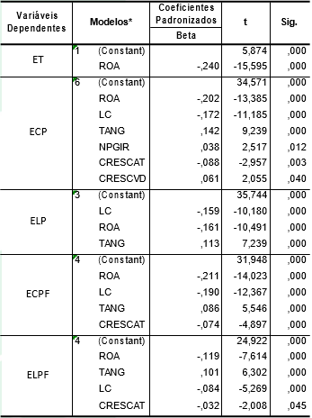 A regressão proposta com ECP apresentou que ROA, LC, TANG, NPGIR, CRESCAT e CRESCVD forma significativas para explicar a variável dependente ao nível de 5% (Tabela 4). Reconhece-se que ROA, LC e CRESCAT (respectivamente -0,202; - 0,172 e -0,088) possuem valores negativos e, em contrapartida, as variáveis independentes NPGIR e CRESCVD (respectivamente 0,142 e 0,061) explicam de maneira positiva a variável dependente. Seu poder explicativo é de 10,73% (Tabela 2). Foi a regressão que mais manteve variáveis independentes no modelo (Tabela 4). É possível destacar que as variáveis NPGIR e CRESCVD tiveram como significância os valores percentuais de 1,2 e 4, ao nível máximo proposto para o modelo de 5%.