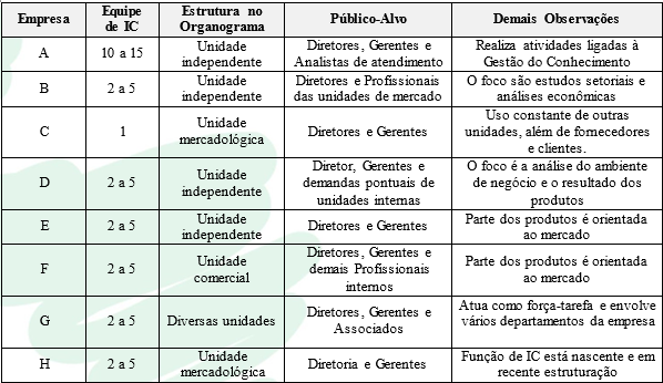 Quanto à amos tra, devido à confidencialidade dos dados , as ins tituições pes quis adas foram nominadas em empres as A, B, C, D, E, F, G e H. Quanto às caraterís ticas da amos tra, foram es colhidas por conveniência da pes quis a. Elas integram os s eguintes s etores : Adminis tração Pública, Apoio ao Des envolvimento Econômico, Comércio Atacadis ta, Ins tituições Financeiras , Órgãos e As s ociações de Clas s e e Petróleo e Gás . O detalhamento s obre a es trutura de IC em cada uma das empres as pode s er verificado no Quadro2.