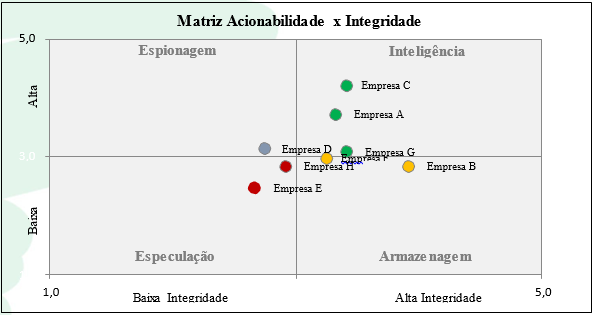 A matriz demons tra que a organizações A, C e G mantiveram média alta para Acionabilidade e integridade. As organizações demons traram capacidade plena de cons trução da área de Inteligência Competitiva. As organizações que obtiveram média alta para Acionabilidade e baixa para Integridade tiveram s uas áreas de inteligência clas s ificadas como de es pionagem, o que pode s er obs ervado para a empres a D. As organizações que não alcançaram média s atis fatória para nenhum dos pilares tiveram s uas áreas de inteligência clas s ificadas como es peculação, padrão percebido nas empres as E e H. As companhias que tiveram média alta para Integridade e baixa para acionabilidade tiveram s uas áreas de inteligência clas s ificadas como de armazenagem, comportamento apres entado na matriz para as empres as B e F.