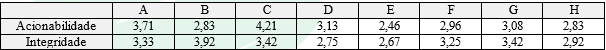 As empres as que apres entam média inferior a 3 nas dimens ões Acionabiliade e Integridade, não cons eguiram demons trar pleno des envolvimento no conjunto de atributos cons titutivos das referidas dimens ões , caracterizando por uma natureza mais informativa.