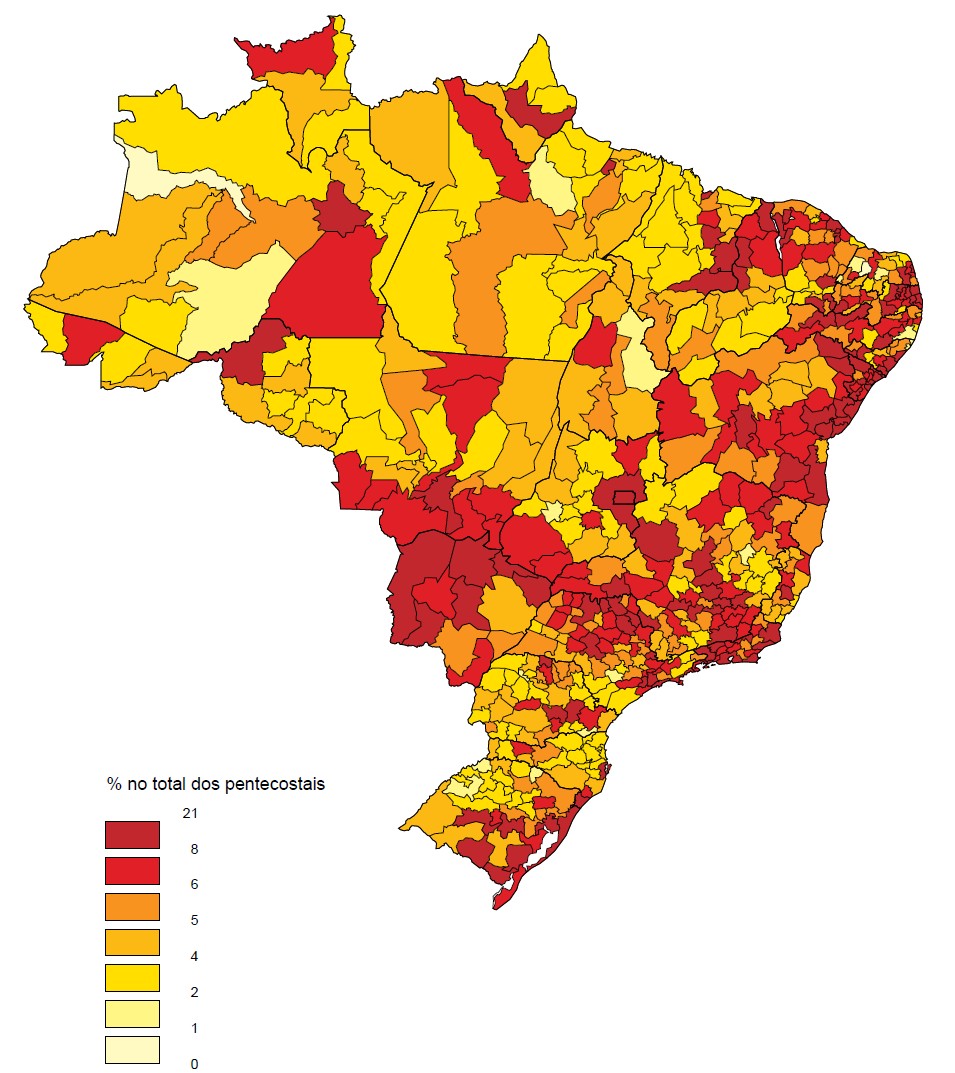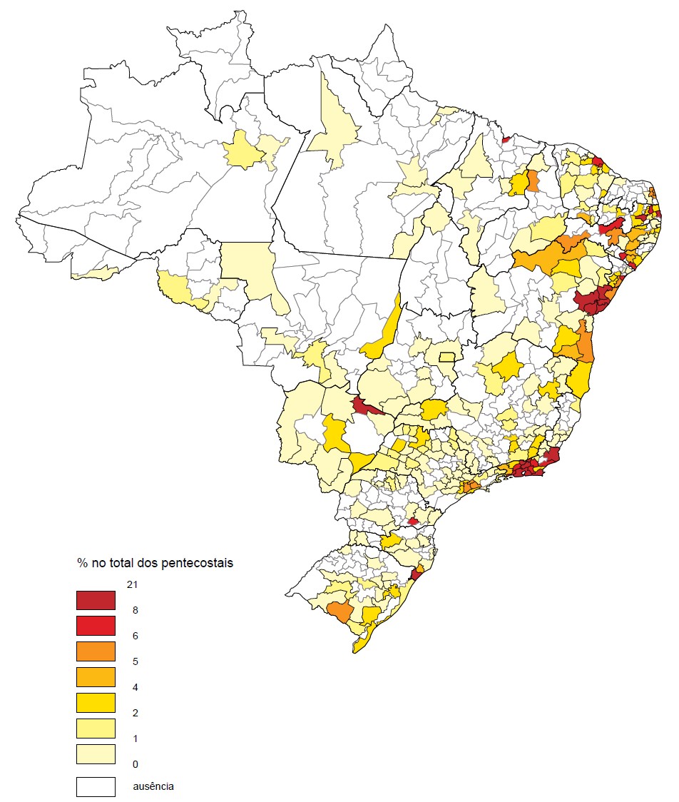 A distribuição da proporção de fiéis da IURD no Brasil no ano de 1991 (Figura 1) mostra uma distribuição bem irregular pelo território. Sua presença era forte na cidade do Rio de Janeiro, sobretudo nos municípios de sua região metropolitana, além de Cabo Frio, Macaé e Campos. Também se destacava em Salvador e outras cidades do Nordeste (Jacob, Hees & Waniez, 2013).