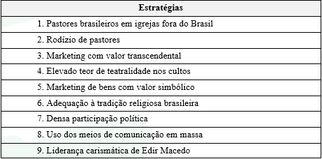 O crescimento da IURD parece relacionado às suas estratégias: pastores brasileiros em templos no exterior; rodízio de pastores; marketing com valor divino; elevado teor de teatralidade nos cultos; marketing de bens com valor simbólico; adequação à tradição religiosa brasileira; densa participação política, uso dos meios de comunicação de massa; e liderança carismática do fundador Edir Macedo.