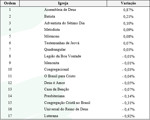 A tabela 2 traz a ordem decrescente das principais igrejas Protestantes em função da variação da quantidade de fiéis no Brasil, no período de 2003 a 2009. Vê-se ali que as maiores igrejas Protestantes cresceram no interregno. Por sua vez, a IURD não só diminuiu, como enfrentou a segunda maior queda dentre todas as igrejas protestantes no Brasil (perdendo apenas, no indicador, para a Igreja Luterana).