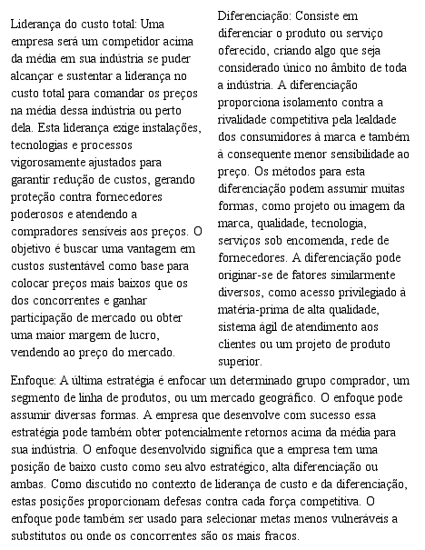 Ao enfrentar as forças competitivas, existem três abordagens estratégicas genéricas potencialmente bem-sucedidas para superar as outras empresas em uma indústria: liderança no custo total, diferenciação e enfoque, sintetizadas no Quadro 1 (Porter, 2004).