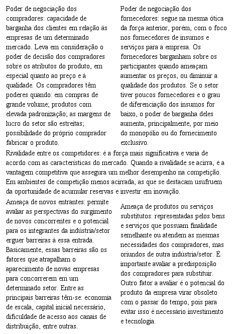 Em qualquer indústria, seja ela doméstica ou internacional, que produza um produto ou um serviço, as regras da concorrência estão englobadas em cinco forças competitivas (Porter, 1989). O objetivo principal das cinco forças é analisar o ambiente competitivo no qual a organização está inserida e determinar o melhor posicionamento do negócio diante dos concorrentes, possibilitando assim, uma visão abrangente da concorrência. Este modelo permite analisar o grau de atividade de um determinado setor da economia, identificando os fatores que afetam a sua competitividade e, ao mesmo tempo, fornecendo uma visão ampla da organização sobre a concorrência e sobre o mercado do qual faz parte.