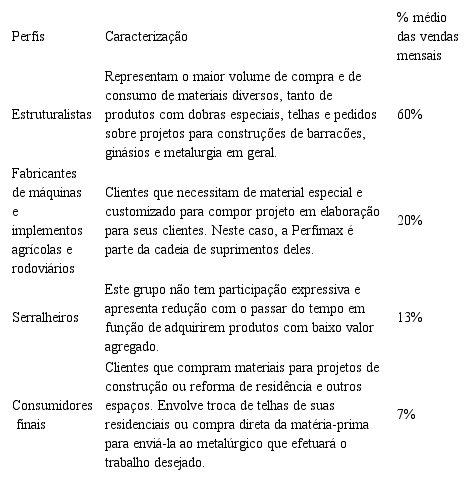 Os principais clientes da empresa podem ser classificados em quatro (4) perfis, que são:
