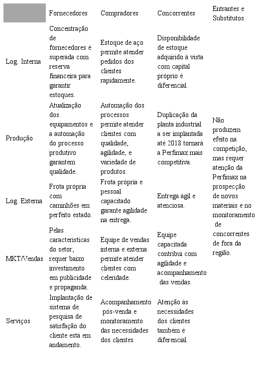 Numa análise geral, é possível afirmar que o posicionamento da Perfimax em relação às cinco (5) forças competitivas está de acordo com a lógica proposta por Porter (2004), em especial para lidar com clientes, fornecedores e concorrentes. No tocante aos produtos substitutos, a Perfimax busca se manter atualizada com as novas tecnologias e materiais, mas sem muita profundidade. Este posicionamento está concentrado no elevado conhecimento do mercado e perfil empreendedor do Diretor Geral, que em duas oportunidades se desfez de patrimônios pessoais para investir na capitalização da empresa que alavancaram crescimento e desenvolvimento. Também se destaca a decisão consciente de reinvestir na empresa significativa parcela dos resultados obtidos.