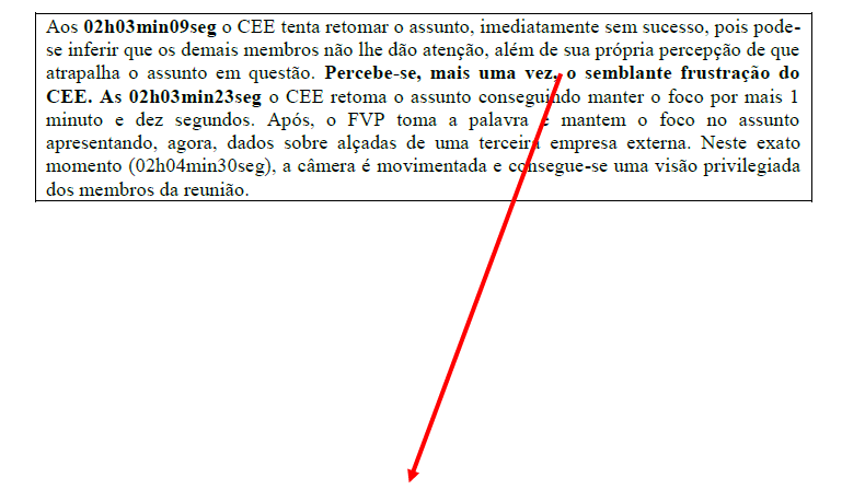 Outro exemplo de utilização do método de observação não participante na área de Administração de Empresas, novamente em Estratégia como Prática, encontra-se no estudo de Marietto (2014) e Marietto e Maccari (2015). O estudo foi conduzido dentro de um pressuposto metodológico multimodal de coleta e análise de dados (Streeck, Goodwin & LeBaron, 2011). Uma das etapas foi realizada por meio de observação não participante. O objetivo do estudo foi o de analisar como os atores sociais (consultores externos e proprietários) de uma Holding brasileira de grande porte interagiam recursivamente com os elementos estruturais, em suas práticas diárias e espaço- temporalmente localizadas, na formação das Estratégias Empresariais. Abaixo, disponibilizamos excertos com suas respectivas marcações e transcrições que serviram para posterior análise.