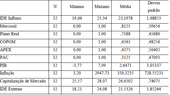 Para que seja possível avançar na apresentação dos resultados é necessário entender a representatividade das variáveis escolhidas para o modelo inicialmente proposto. Para isso, a tabela 1 apresenta as estatísticas descritivas com base nos dados coletados.