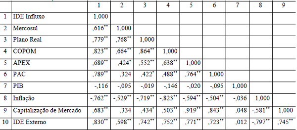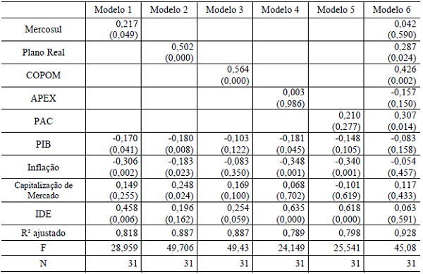 Na tabela 3, no modelo 1, o Mercosul apresentou resultado positivo e significativamente relevante (β= 0,217 sig. < 0,049). Esse resultado pode se explicar pela criação do bloco econômico, como uma política pública que deu certo. Derrubou barreiras protecionistas, estimulou o livre comércio, estimulou a circulação de pessoas e mercadorias sem burocracias entre os países membros. Além disso, a formação do bloco econômico ampliou o mercado potencial das empresas que se instalam no Brasil, possibilitando o livre comércio entre os países da América Latina. O que explica também esse aumento significativo do IDE no Brasil é a liderança natural do país no bloco.