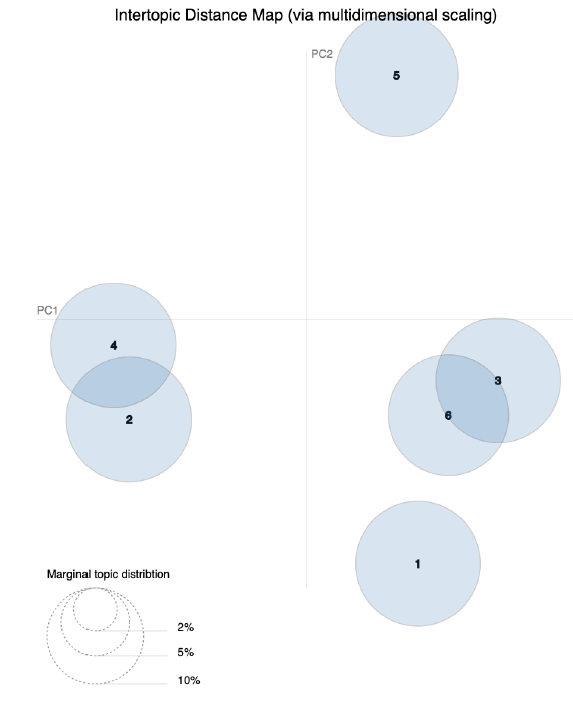 Now that the topics are present, we will delve into the relationship amongst the topics. By using the Python port of the . package 'LDAvis' (Sievert & Shirley, 2014), I was able to generate a multidimensional scaling (MDS) (Torgerson,1958). In figure 3, there are two main axes of the MDS: the x-axis and y-axis. In this Cartesian space, all distances are assumed as Euclidean. We can see that there are clearly 3 groups. Topic 2 and 4 are grouped together. Furthermore, Topics 1, 3 and 6 are also grouped together opposite to Topic 2 and 4. The final group is composed of a single topic, Topic 5, and is the opposite position of both remaining groups. The MDS elucidates that "Topic 4 - Learning and Cooperation" is very similar to "Topic 2 - International Business and Top Management Team"; and that "Topic 1 - Strategy and Competitive Advantage", along with "Topic 3 - Entrepreneurship" and "Topic 6 - Dynamic Capabilities and Small Firms" share similarities. These two groups are opposed to each other in the main axis (the PC1 on the x-axis). Isolated without similarities to any topic is "Topic 5 - Finance and Strategy".