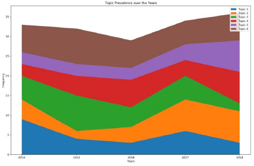 Finally, I present the topic predominance over the years in Figure 4. It has some trends to note. First, Topic 1 - Strategy and Competitive Advantage and Topic 3 - Entrepreneurship were predominant in 2014 and declined towards 2018. Second, Topic 2 - International Business and Top Management Team and Topic 5 - Finance and Strategy are on the rise from 2016 onwards. Third, Topic 4 - Learning and Cooperation and Topic 6 - Dynamic Capabilities remained steady during the timeframe of analysis. Regarding the decline of Topic 1--which is a general topic, this can be interpreted as a specialization of the journal. As the years go by, IJSM started to publish more specialized content that was grouped into other topics. The rise of Topic 2 and Topic 5 can be seen as a trend towards more publications about finance, international business, and top management team.