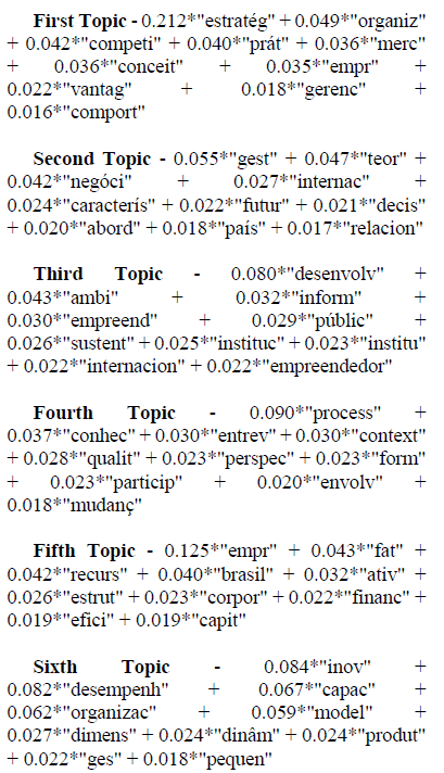 The final topic, Topic 6, has the following terms: "inov"; "desempenh"; "capac"; "organizac"; "model"; "dimens"; "dinâm"; "produt"; "ges"; and "pequen". The most representative document for the topic is "Capacidades de Inovação em Serviços: Um Estudo nos Supermercados em Santa Catarina". The topic comprises the terms "capac" and "dinâm" which means dynamic capability and also has the terms "pequen" meaning small firms. Therefore, Topic 6 is defined as "Dynamic Capabilities and Small Firms".