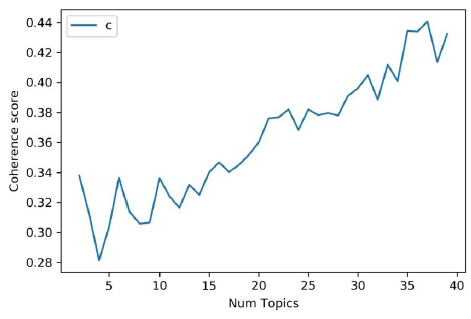 With the documents pre-processed as inputs, I generated a LDA model for each topic quantity, starting in 2 up to 40 topics. In figure 1, it is possible to see the coherence slowly creeping up as the number of topics increase. There is a tradeoff between coherence and topic numbers in a specific LDA topic Comodel. Particularly in this study, for the highest coherence value, I had two choices of topic models that have the same coherence value of 0.336. The first model has 6 topics and the second 10 topics. Since the coherence value is the same, I chose (following the Occam's razor principle) the model with the least number of topics.