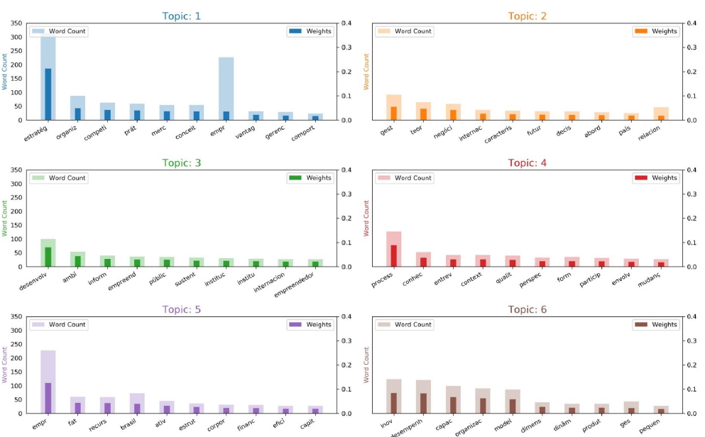The topic model has 6 topics. You can find each terms' weight for all the topics in Appendix I. Also, Figure 2 shows the topic's terms counts and weights for each one the of 6 topics. The first one is comprised of the terms: "estratég"; "organiz"; "competi"; "prát"; "merc"; "conceit"; "empr"; "vantag"; "gerenc"; and "comport".