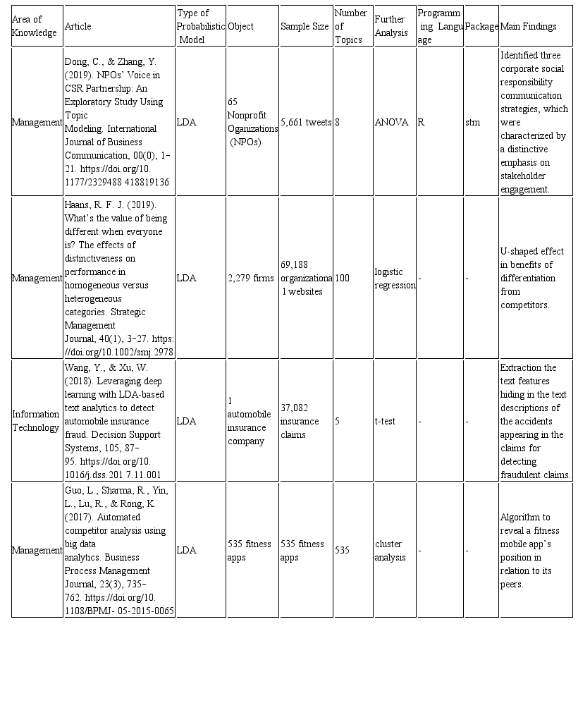 Some studies depicted in table 1 also employ further quantitative analysis of the data generated by topic models. As already covered in previous sections, researchers can apply topic modeling to textual data to generate non-biased categories and labels. These measures may be later included in quantitative analysis to test hypotheses. Most of the studies in table 1 employ a supervised statistical analysis, which means that a dependent variable is guiding the analysis (ANOVA, .-tests, regressions, structured equation modeling, etc.). There is also a minority of studies that are concerned about unsupervised statistical analyses that do not have an important variable to guide the analysis, but the focus is to find similarities amongst their sample (clustering, social networks, measures of similarities, etc.).