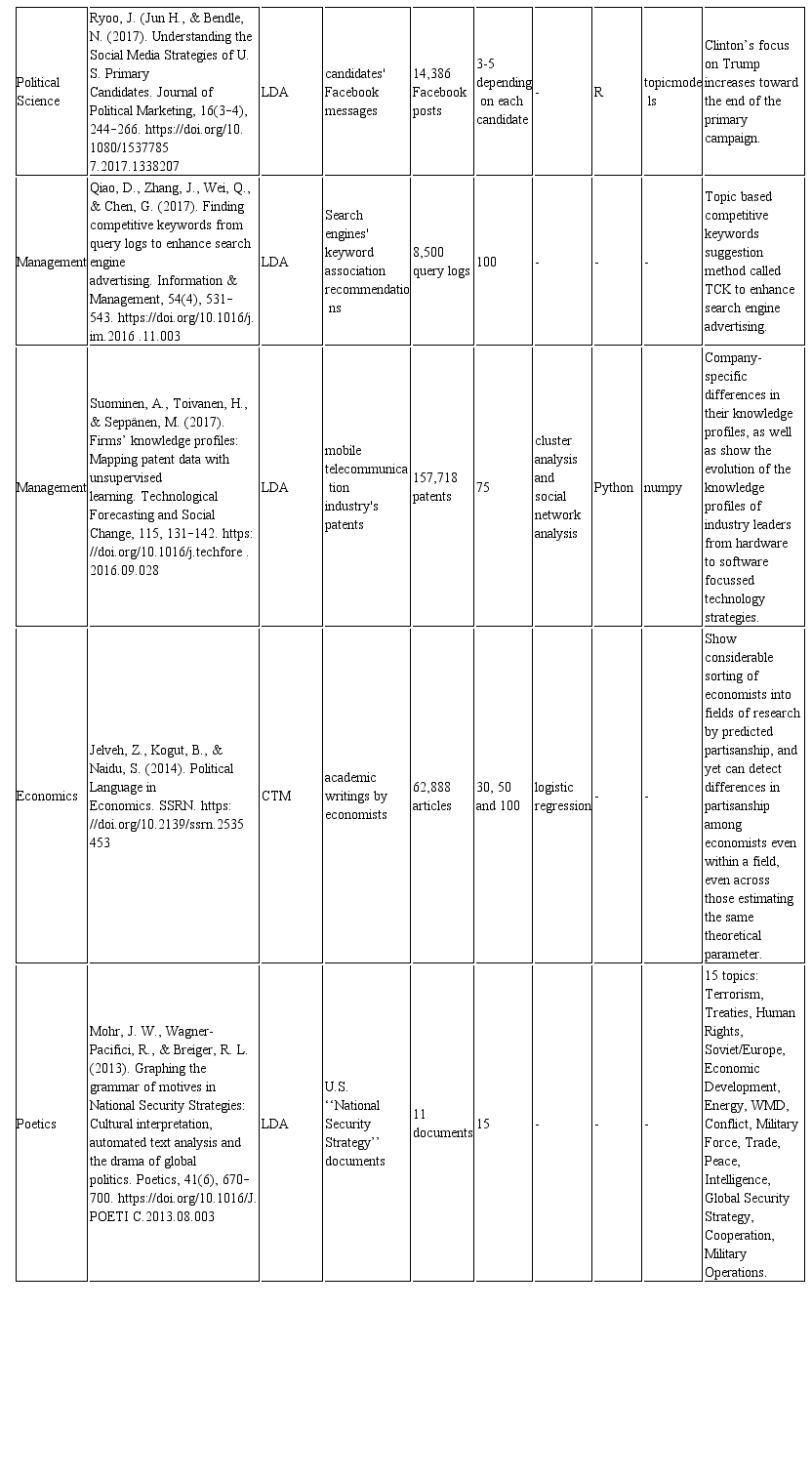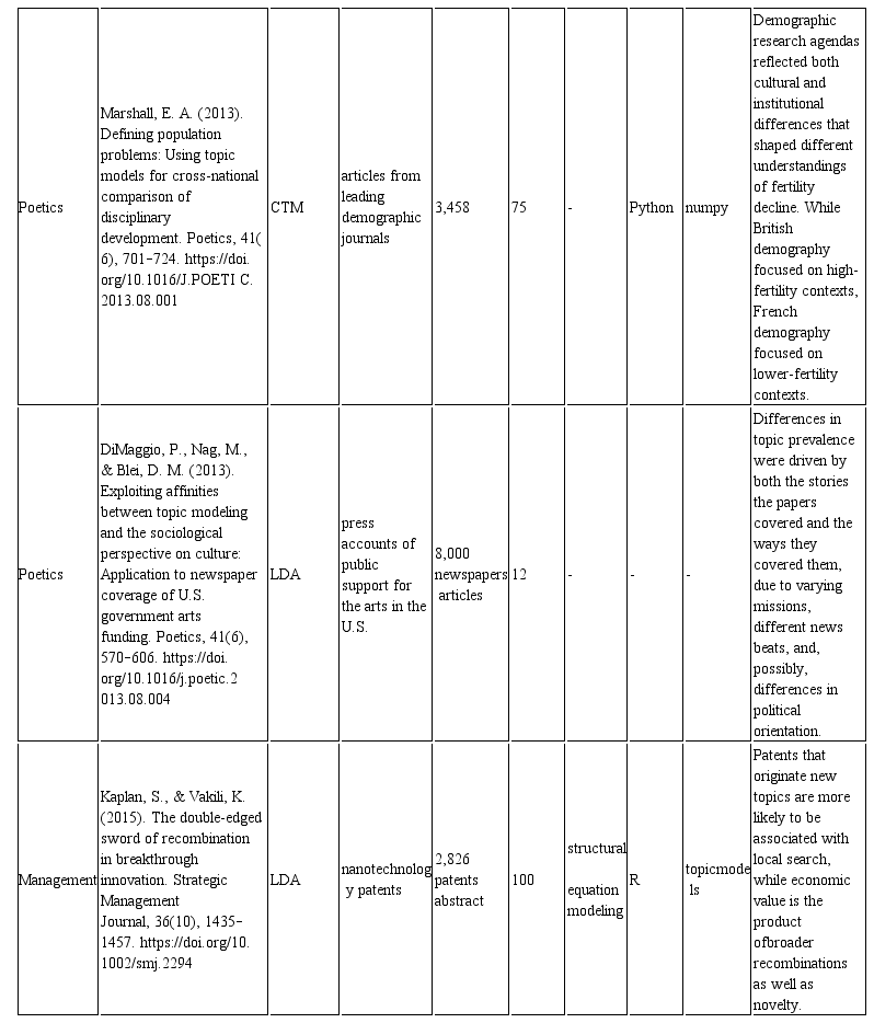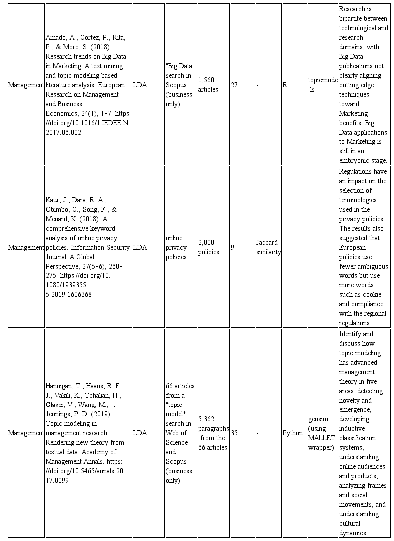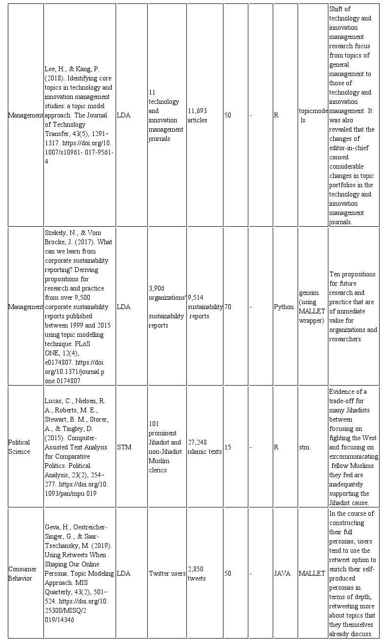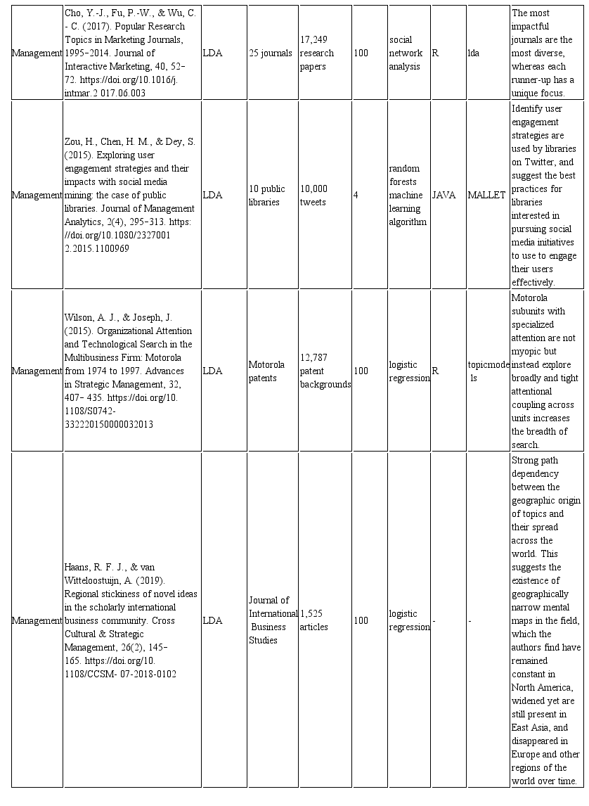 Researchers have been applying topic modeling and other CATA since its inception in 2003 (Blei et al., 2003). In table 1, I present a curated sample of 23 good examples of topic modeling research articles. Most of the articles are from management (65%), but there are some from other social sciences. Also, the articles' sample sizes are notoriously large: the median is 8,000, and the mean is 18,063.