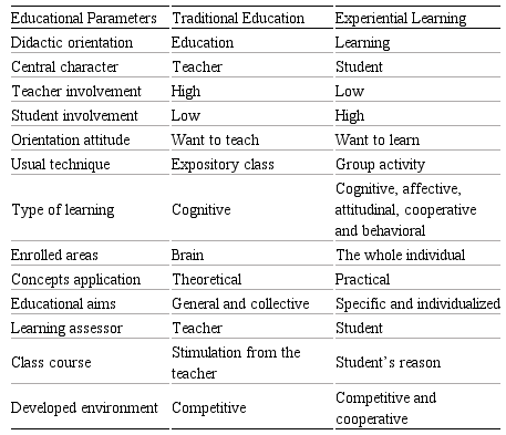 Some differences can be identified between the traditional education and experiential learning on the emphasis of the teaching and learning process, the roles of the teacher and student, used techniques, learning theories in which they are reasoned, focus of the process and other. These differences, pointed by Sauaia (1995), can be observed in Table 1.