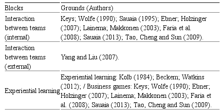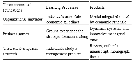 The management laboratory is an environment in which the students are grouped in teams to practice decision-making in a business game setting whereas they develop an applied research from their managerial experience. Different applied investigations in Administration are produced in the framework of the management laboratory (Sauaia, 2013). The business game belongs to the conceptual tripod of the management laboratory, together with the organizational simulator and applied research (Sauaia, 2013). The theoretical model of the management laboratory is displayed in Table 2.