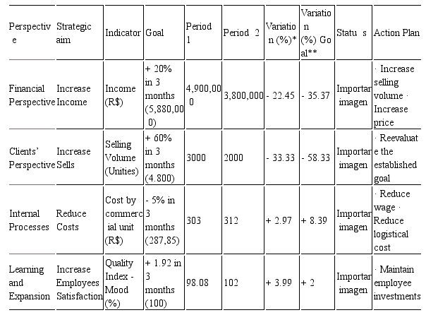 The stages’ linkage in Table 6 should be noted. As an example, the strategic aims established in BSC are the same from the guidelines’ stages. In the same way, for each strategic objective, new indicators are set together. Columns T1 and T2 should be filled with real values regarding the period’s results. In sequence, should be filled in the variations (%) of a period in comparison to the previous and regarding the goal. From the result obtained, the status may be positive or negative, and a new action plan is defined by considering the strategic aim.