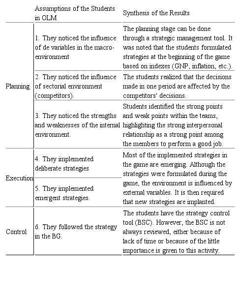 Concerning the planning stage, it was possible to identify that the students had previously elaborated the strategic management based on the variables of the macro-environment (GNP, seasonality, inflation, among others). The students declared that OLM is more challenging than traditional teamwork, once it demands a higher rationale over the possible strategies that can be developed by the other teams (competitors).