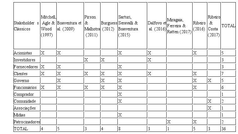 A Tabela 1 enumera diversos estudos e apresenta os stakeholders identificados em cada um deles.
