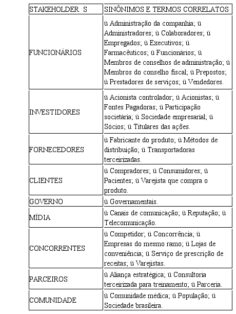Os de stakeholders buscados nos formulários são os stakeholders apresentados na Tabela 1. Contudo, há diversos sinônimos e termos correlatos, os quais também foram considerados na análise, e que são evidenciados na Tabela 3. Esses sinônimos foram identificados por meio de uma leitura inicial dos formulários. A mesma abordagem foi ulizada por Lugoboni e Goto (2018). Tal procedimento é proposto por Bardin (2016) quando explica que esta atividade faz parte também da pré-analise e é chamada de “a referenciação dos índices e a elaboração dos indicadores”.