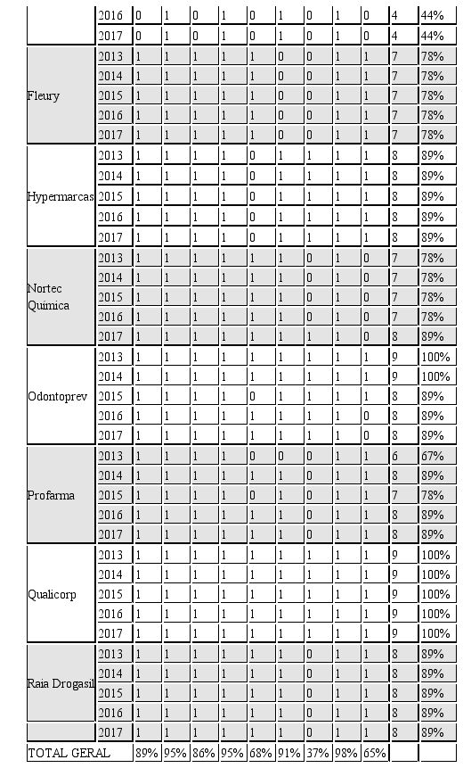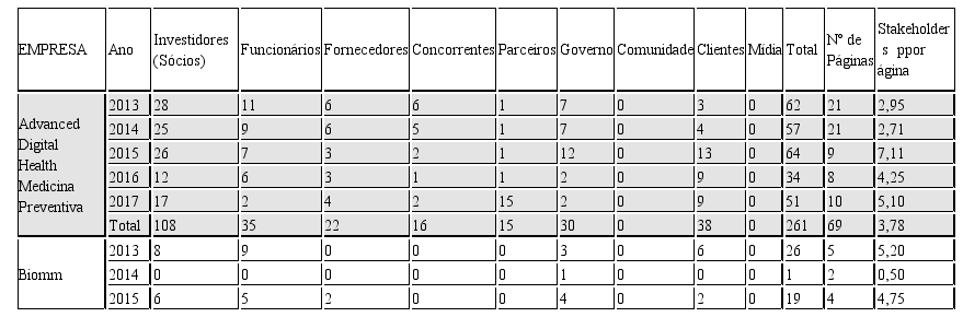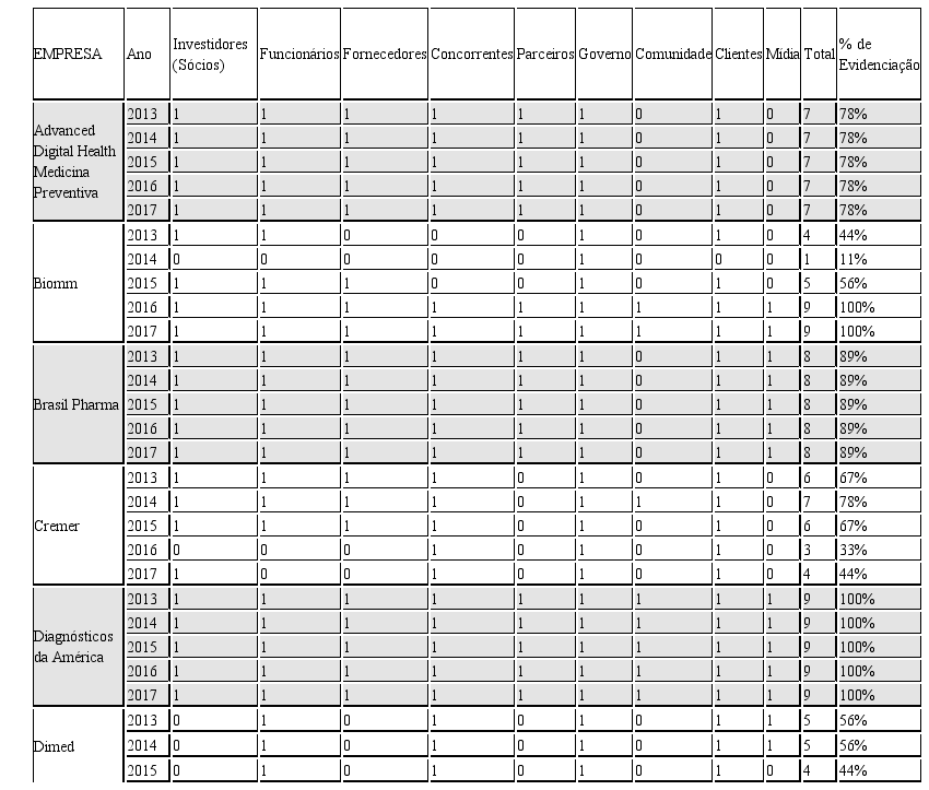 No que se refere às empresas, destaca-se que sete delas mantiveram o mesmo nível de evidenciação ao longo dos anos: Advanced Digital Health Medicina Preventiva, Brasil Pharma, Diagnósticos da America, Fleury, Hypermarcas, Qualicorp e Raia Drogasil. Vale mencionar que duas destas obtiveram 100% de evidenciação, ou seja, mencionaram todos os 9 (nove) stakeholders listados em todos os anos analisados.