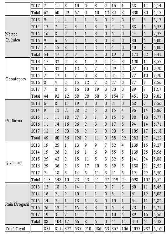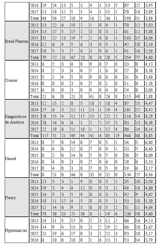 No que se refere à amostra do estudo, optou-se por estudar empresas de capital aberto do setor de saúde, as quais totalizavam 31 no site da B3. Na sequência, verificou-se quais delas haviam publicado Formulário de Referência nos anos de 2013 a 2017 em seus respectivos sites. Optou-se por esse recorte pois esperava-se observar a evolução dos últimos anos e até o momento da pesquisa muitas empresas ainda não haviam disponibilizados os relatórios de 2018. Com isso, chegou-se a um total de 13 empresas: