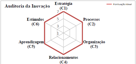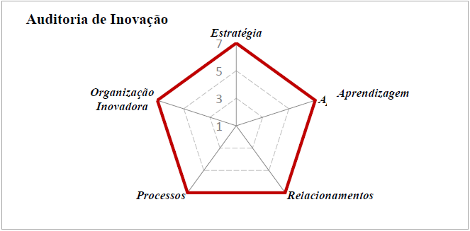 Neste estudo, foi utilizado o modelo proposto por Tidd e Bessant (2015), denominado pelos autores como “Auditoria de Inovação”, cuja aplicação orienta melhorias no processo de inovação das organizações e nas formas por meio das quais ele é gerenciado. Os autores propõem o uso de uma ferramenta de autoavaliação a partir de 40 afirmativas, orientadas em torno de cinco dimensões: i) Estratégia; ii) Aprendizagem; iii) Relacionamentos; iv) Processos e; v) Organização Inovadora, e que devem ser pontuadas numa escala de 1 a 7 pontos, sento sete a pontuação ideal. Ao término da apuração, deve ser traçado um perfil para cada uma das dimensões (Figura 1).