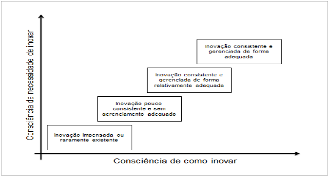 Para classificação do grau de maturidade seria realizado o cômputo dos resultados apurados no processo de auditoria e, por conseguinte, feito o posicionamento da amostra em um diagrama parametrizado, ora denominado “Posicionamento da Maturidade em Inovação para SMEs”, visando confrontar dois elementos fundamentais: i) a “consciência da necessidade de inovar” e; ii) a “consciência de como inovar” (Figura 10).