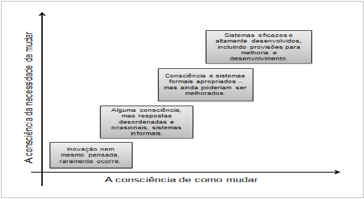 Complementando, Tidd e Bessant (2015) sugerem ainda uma “estrutura para refletir sobre o desenvolvimento das competências necessárias para a gestão da inovação” (Figura 2), a qual, na prática, busca definir uma estrutura para aferição do grau de maturidade da inovação na organização investigada.