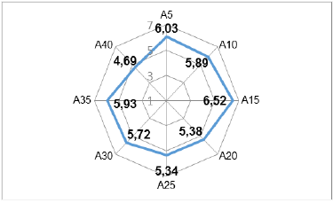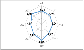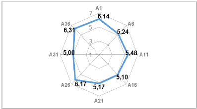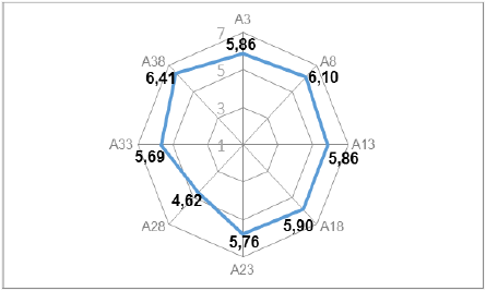 A avaliação proposta seria realizada em torno das 48 questões, também pontuadas numa escala de 1 a 7 pontos, sendo 7 a pontuação ideal. Ao término da apuração, seria traçado um perfil para cada uma das dimensões (Figura 9), constituindo um ‘Hexágono da Inovação’.