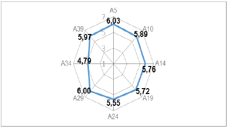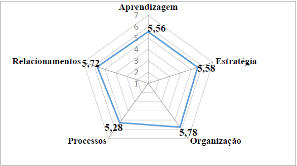 A partir da análise de cada um dos constructos do modelo de Auditoria de Inovação (Tidd & Bessant, 2015), depreendese que o constructo “Processos” obteve a menor média (5,28 pontos), seguido dos constructos “Aprendizagem” (5,56), “Estratégia” (5,58), “Relacionamento” (5,72) e, por fim, “Organização” (5,78). A média geral foi de 5,58 pontos.