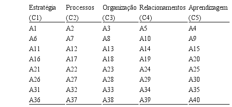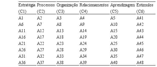 Entretanto, o fator 'estímulos e incentivos provenientes de políticas públicas', destacado como essencial para o desenvolvimento da inovação no ambiente das SMEs pelos consultores especialistas, não é contemplado no modelo de auditoria original. Ou seja, questões relacionadas a influências advindas do contexto externo (de fora da organização) e que geram impacto no desenvolvimento da inovação, especialmente quando consideradas as características das SMEs no Brasil, não são identificadas pelo modelo original de Tidd e Bessant (2015). Dessa forma, o objetivo de confrontar os resultados quantitativos representativos da realidade das SMEs quanto à gestão da inovação visando refinar a modelagem proposta junto a consultores e especialistas neste segmento de empresas, foi alcançado, e se justificou como um dos pontos inovadores do trabalho, fornecendo subsídios para o desenvolvimento de um novo modelo adaptado à realidade deste perfil de empresas. Desse modo, um modelo que pretenda avaliar a maturidade da inovação no contexto das SMEs, via auditoria da gestão da inovação, deveria possuir uma dimensão que buscasse avaliar o impacto das políticas públicas no desenvolvimento da inovação neste tipo de organização. Nesta perspectiva, é apresentado a seguir um modelo adaptado do arquétipo proposto por Tidd e Bessant (2015), no qual se propõe a inclusão de uma nova dimensão, doravante denominada “Estímulos”, que buscaria contemplar a análise da inovação na perspectiva dos estímulos e incentivos provenientes de políticas públicas. Assim, a avaliação para mensuração dos aspectos adstritos à gestão da inovação seria composta por quarenta e oito afirmativas, distribuídas em torno de seis pilares ou dimensões (constructos): (C1) Estratégia, (C2) Processos, (C3) Organização Inovadora, (C4) Relacionamentos, (C5) Aprendizagem e (C6) Estímulos (Tabela 3).