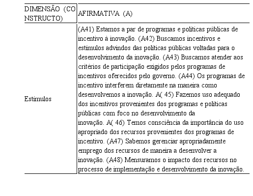 A análise do constructo “Estímulos” se daria em torno de 8 afirmativas (A41 a A48), cujo propósito seria identificar o posicionamento no que diz respeito às políticas públicas como meio de incentivo e influência no desenvolvimento da inovação no ambiente das SMEs.